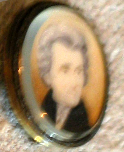 Description:Miniature bust-length of Jackson in an oval pin. He is wearing a black coat, white shirt and tie. The background is beige. His hair is grey and his head is turned left. The setting is gold with a narrow decorative engraved border. A beveled glass covers the work. Inscribed: "John D. Coffee/-from-/Genl. Andrew Jackson./-1835."