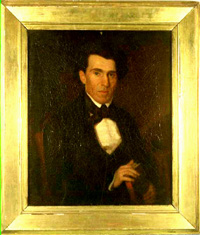 As of 1999, portrait was considered to be in fair condition. There is cracking and chipping on the surface of the image. It is a portrait of the upper body of a man. He is holding a small book and wearing a dark suit and a white shirt.